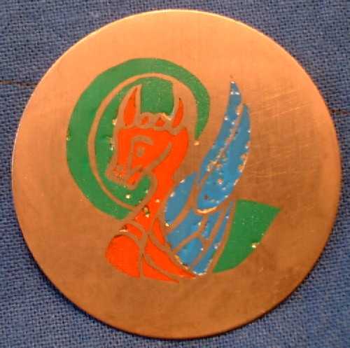 Enamel created during the course at the University event using materials supplied by Arenwald and Oriane. Design, etching, filling, baking and grinding off conducted by Terafan. The execution of the design, etching of the ground, and filling with enamel and baking were conducted at the class and in the evening following. Grinding off an polishing were done after the event.