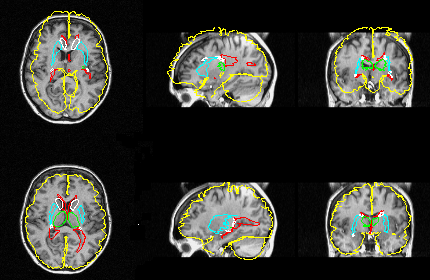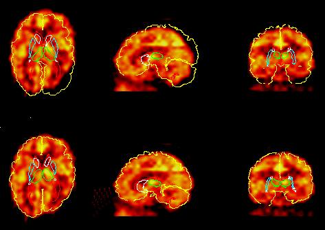 PET data before (upper row) and after (lower row) fully automatic matching of the atlas