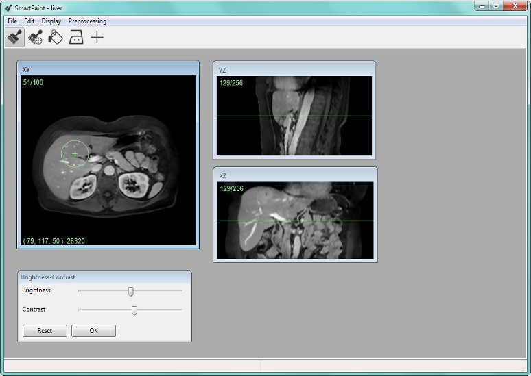 The above picture shows a screenshot of the SmartPaint user interface. SmartPaint shows the image data in three orthogonal views. The segmentation tools can be used in any of the views, and the results are updated globally. The three views can be moved and resized freely. The user can scroll between slices in any of the views using either the mouse wheel or the up/down arrow keys.