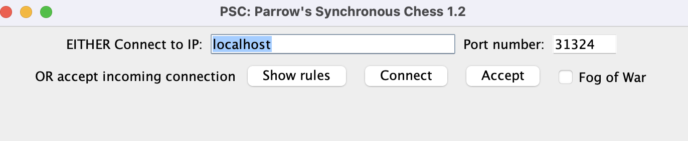 Here you can type in the IP number and the port number you wish to play against. By clicking Connect, the program attempts to connect. Or you may instead choose to wait for someone connecting to you, by clicking Accept.