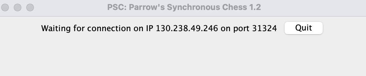 Here the program remains until another player starts the program and connects to that IP and port. You can try it out locally by starting the program twice and write localhost for IP.