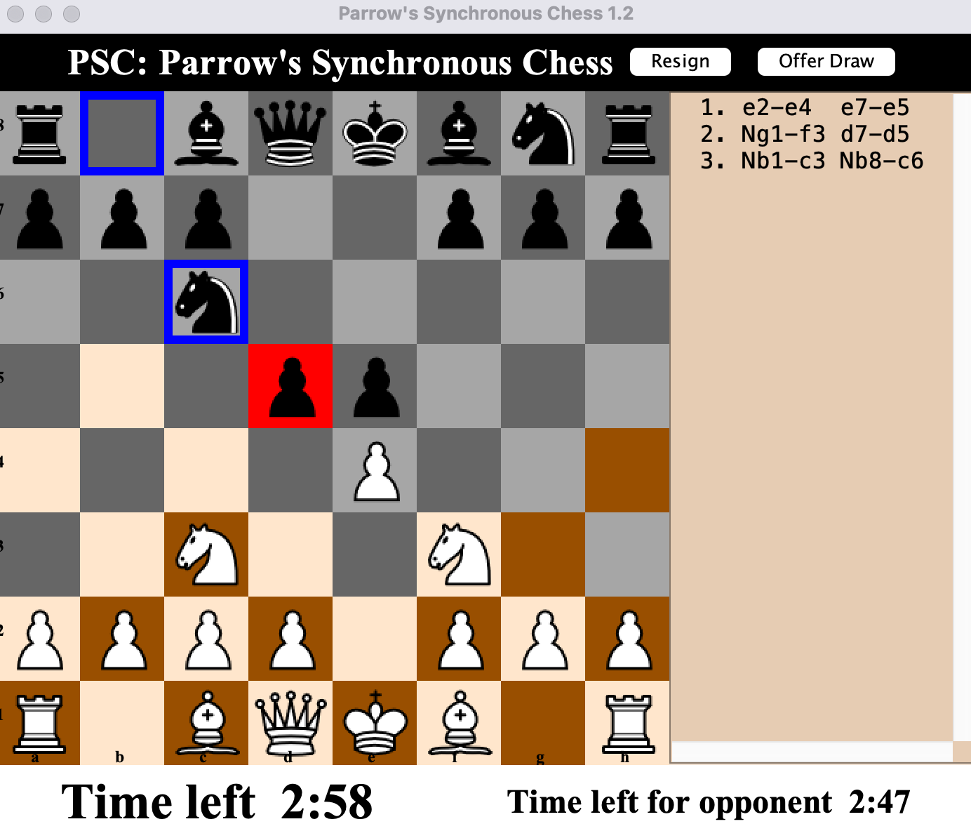 This is possible since moves cannot interfere, because of the following. A player may make a move only to a square the player controls. A square is controlled by a player if it is attacked by strictly more pieces than by the opponent. A piece attacks all squares it can move to, and all pieces it can capture, and also the square where it sits. Controlled squares are highlighted (toggle the space bar to instead highlight the squares controlled by the opponent). A piece never attacks another piece of the same colour (since it cannot go there).